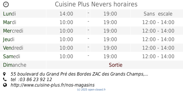 It is also possible to : Modifier ces HEURES D'OUVERTURE of Store Cuisine Plus Dans Nevers, 55 boulevard du Grand Pré des Bordes ZAC des Grands Champs,